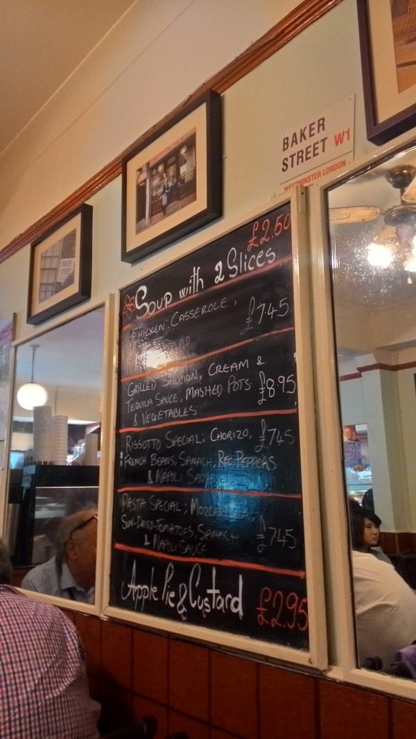 И персонал там очень душевный. Владелец кафе, приятный дядечка, сам сидел на кассе и приветствовал посетителей. Девушка, которая нас обслуживала, была очень мила и улыбчива. Она уверенно сновала между столиков, успевая при этом перекидываться фразами с постоянными посетителями. У меня вообще сложилось впечатление, что это такое семейное местечко, куда заходят семьями из близлежащих домов, чтобы уютно посидеть и поесть вкусных сэндвичей или салатов. Опять же, еда там исключительная. На стенах – много фотографий из Шерлока, что совершенно не удивительно. А меню – довольно разнообразное и вполне доступное с ценовой точки зрения.