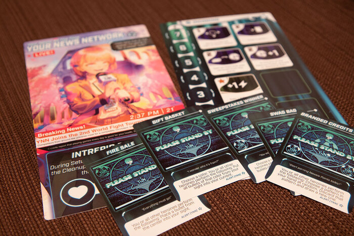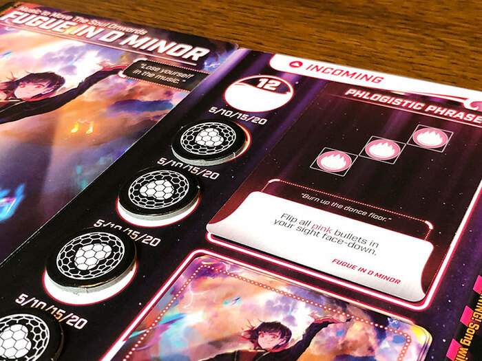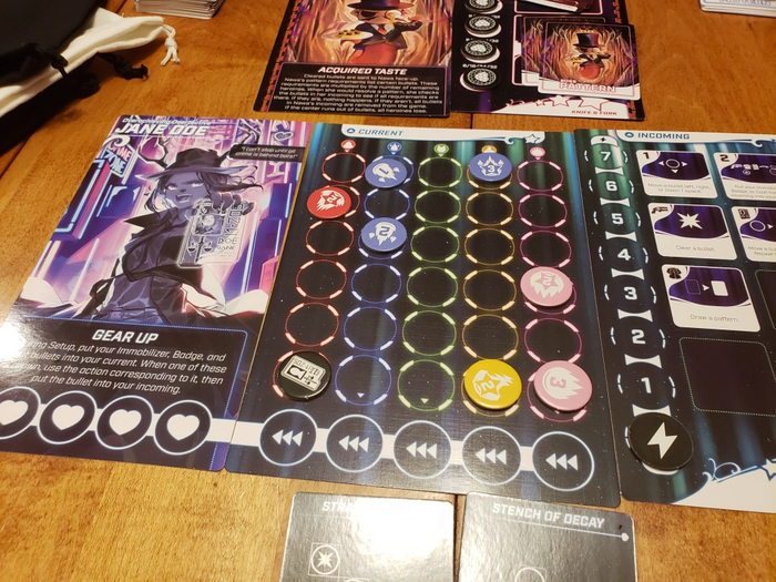 Во первых, чтобы убирать пули с планшета мы используем особые приемы. Когда на планшете пули складываются в определенный узор, такой же как на карте приема, мы используем его и скидываем все пули соседу (загаживая ворохом пуль его мешок). А вот как мы используем эти приемы, зависит от выбора персонажа. У каждой из них своя колода этих приемов и варианты использования. Кто то использует в раунде сразу все карты, кто то ворочает эти карты на все 360 градусов, кто то имеет дополнительные жетоны со своими приколами. В общем и целом получается так, что каждая из героинь, это небольшая мини игра в основном геймплее. И поверьте мне, когда мы играем за какую то из них впервые, а там сбоку тикает таймер на 3 минуты под гитарные аниме запилы, мозг начинает плавится а руки хаотично доставать из мешка, все что нужно и не нужно