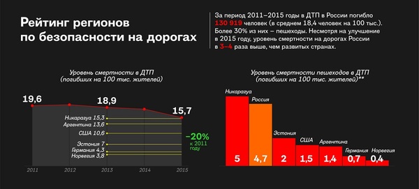 В 2015 году в России в ДТП погибло более 21 тысячи человек (и это без статистики за декабрь). В новостях, как правило, принято обсуждать теракты и катастрофы, но именно ДТП – одна из самых вероятных причин смерти россиянина, не связанных с его здоровьем. Треть погибших – пешеходы.