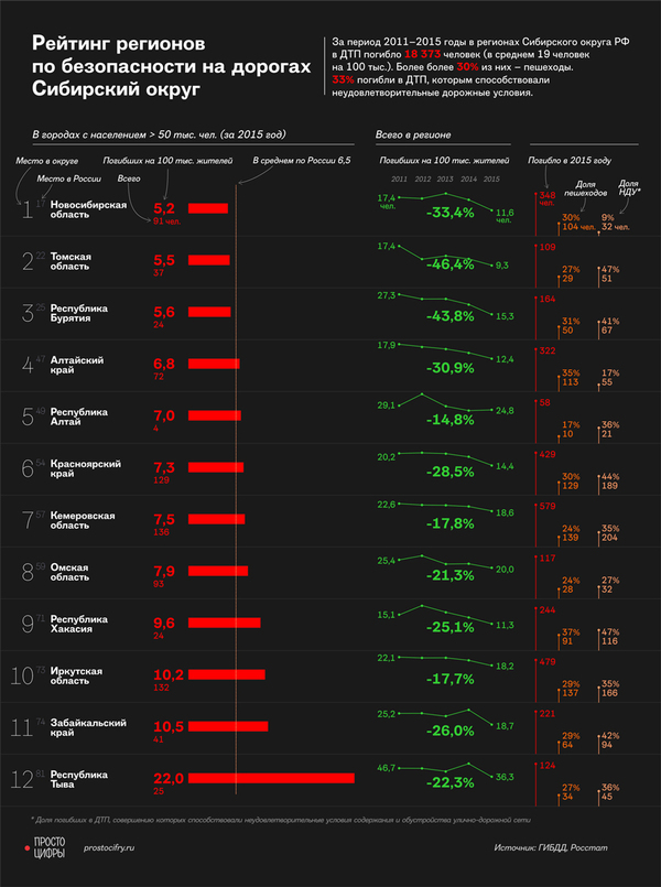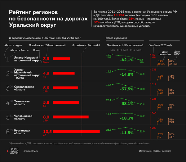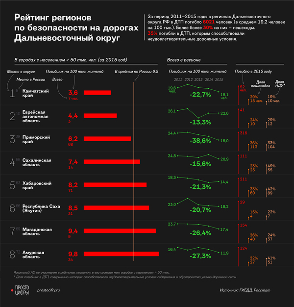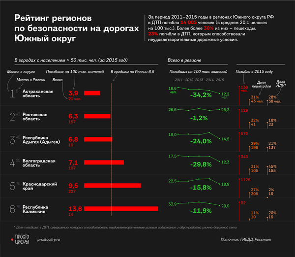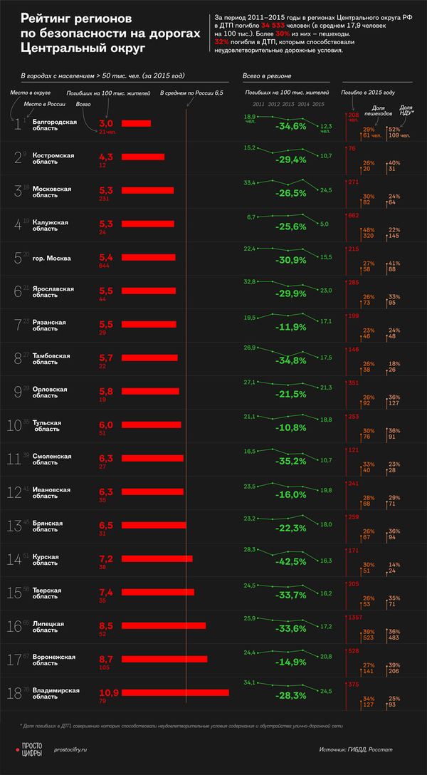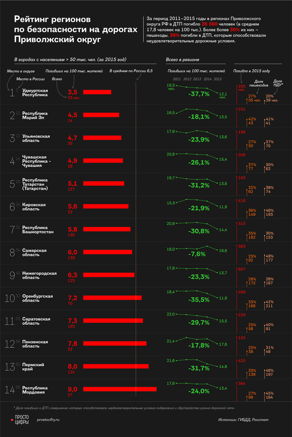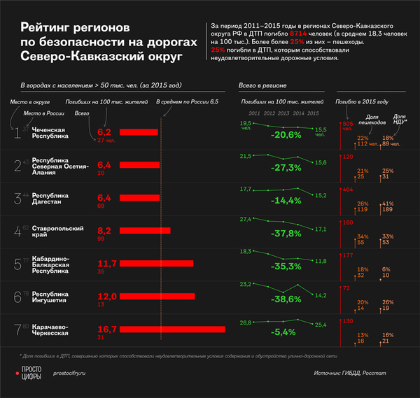 Выше всего смертность на дорогах в Тыве (22 погибших на 100 тыс. жителей), Карачаево-Черкесии (16,7), Калмыкии (13,6), Ингушетии (12) и Кабардино-Балкарии (11,7). Очевидно, что больших городов в этих республиках просто нет. Это значит, что количество машин в городе и плотность трафика не являются главными факторами смертности на дорогах.