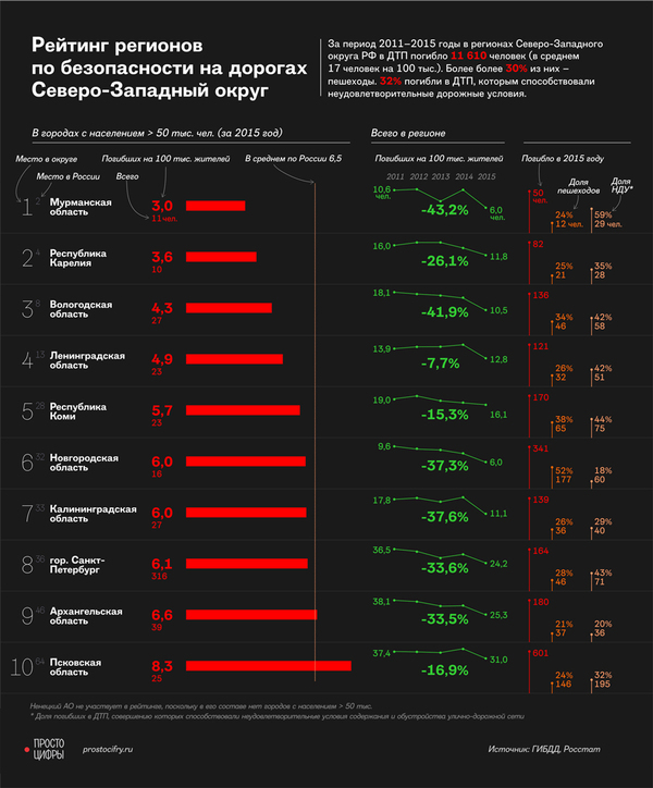 Как выяснилось, самые безопасные улицы – в городах Белгородской и Мурманской областей (3 погибших на 100 тыс. жителей), Удмуртии (3,5), Карелии (3,6) и Камчатского края (3,6).