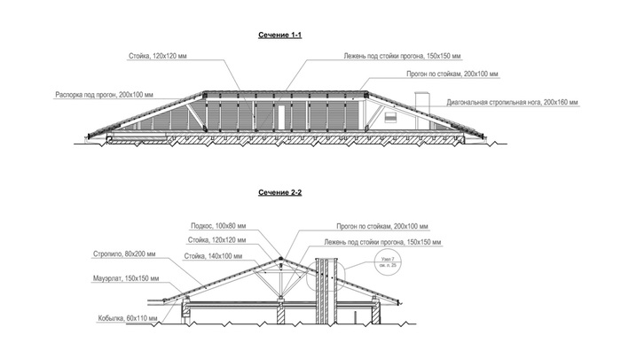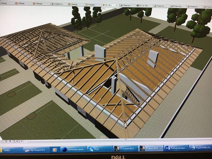 После скитаний, консервировать или строить - решил строить, в зиму. Вроде бы особо проблем с этим быть не должно. Перекрытия закончили вовремя, следующим этапом должен строиться каркас крыши (стропильная система). Ниже представлены чертежи крыши, не совсем финальные, но в целом представления о предстоящей работе дают.
