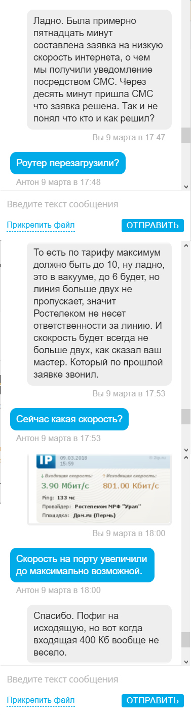 Довольно долго был тариф 2 Мбит/с за 300 р. но появились новые и я переключил им тариф, "Максимальная скорость" за 340 р. в месяц. Хоть и ADSL, но хотя бы 5 Мбит/с должно быть. Лучше чем 2. Но через некоторое время время тесть с тещей стали жаловаться что толком ничего не грузит. Проверил скорость на разные сервера, а там черным по белому, до любого серевера по области 1,75 Мбит входящая и 375 Кбит/с исходящая. Проверял через 2ip. Начал писать в тех поддержку, долго с ними в чате ругался (вежливо). Естественно всю переписку включать не буду. Только основное.