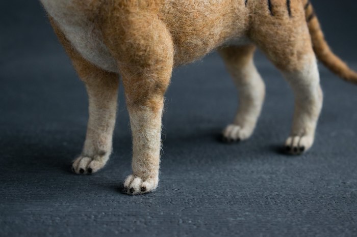 Сумчатый волк свалян на каркасе, в длину около 20 см без хвоста. Глаза из полимерной глины, тонировка масляными красками. Переходы цвета полностью из шерсти