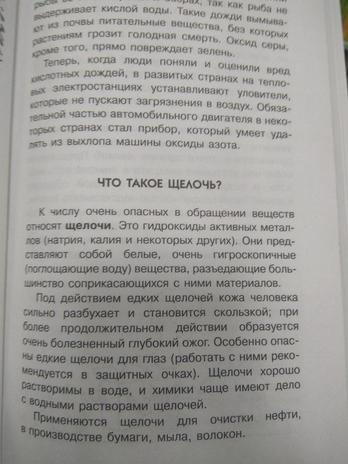 Конечно, можно придраться к утверждению, что щёлочи разъедают большинство материалов (по-видимому пластик, большинство металлов, стекло, лакокрасочные покрытия, гранит и мрамор относятся к меньшинству окружающих нас материалов). Но ведь по существу-то сказано верно. Щёлочи — это гидроксиды активных металлов, которые хорошо растворимы в воде. К сожалению, уже на следующем развороте нас ждёт большое разочарование:
