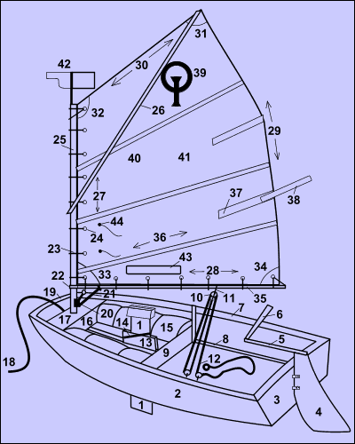 Первое, с чем сталкивается новичок - это теория. Строение яхты, заучивание правил и различных курсов направления яхты по отношению к ветру. Сюда же входило правило "Яхта не плавает, а ходит". Строение оптимиста достаточно стандартное, его можно брать как базу, если в дальнейшем будет спортивный рост. Парус и корпус. Начнем с паруса. Что такое мачта, наверное знает каждый. Мачта обеспевивает вертикальное натяжение паруса, а гик - горизонтальное (пенпендикуляр). Диагональное натяжение обеспечивает шпринтов, на конце которого имеется маленкий отросток, удлинение, которое вставляется в верхний угол паруса (петлю или люверс). Люверс - это небольшое круглое отверстие, вырезанное в парусе и зафиксированное железным каркасом. Люверсы нужны для фиксации паруса к мачте, гику, шпринтову и многому другому. Шкоты (номер 12) регулируют движение гика. Под номером 21 обозначена натяжка, которая фиксирует гик книзу. Иногда гик нужно ослабить, иногда дотянуть. Процесс настройки паруса - очень сложный, порой приходится по 10 раз регулировать натяжение гика, шпринтова, чтобы парус не был как доска или же не болтался как труселя на балконе.