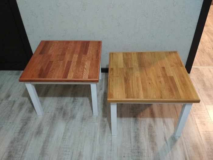 Фото плохо передаёт цвет и фактурность покрытия. В реале все смотрится гораздо живее и переливает под разными углами зрения. Обе столешницы покрыта маслом. левая с колером Рябина, правая с Подсолнухом. Основа столиков из сосны и покрыта белой акриловой краской.