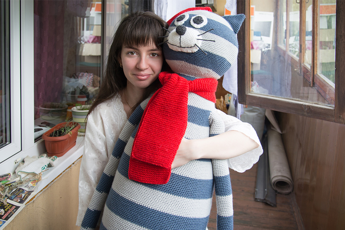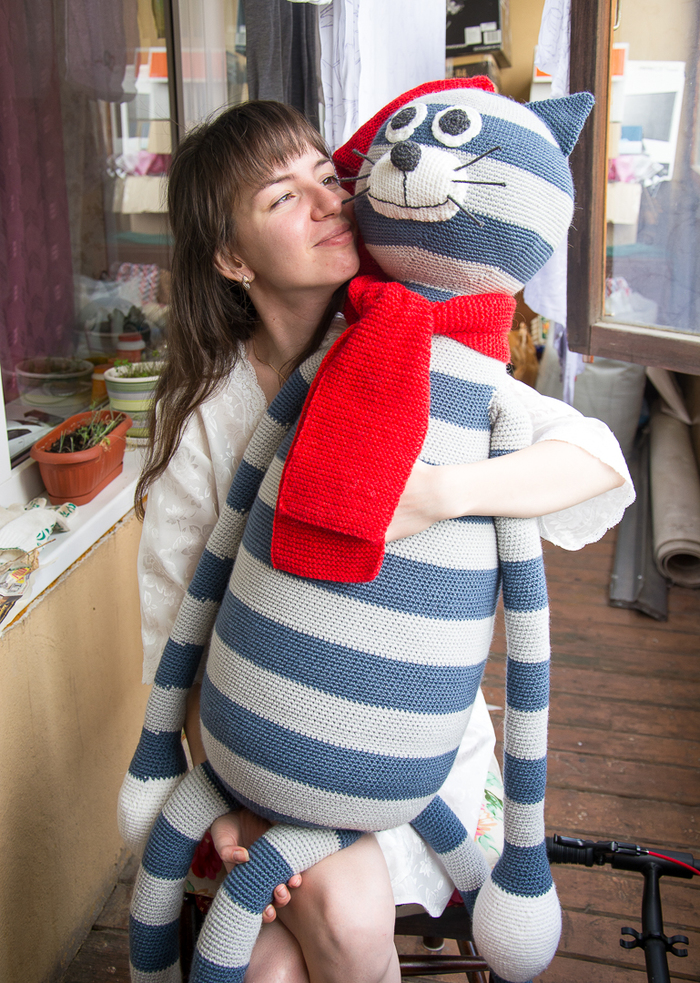 Увидел пост про Розовую Пантеру и решил поделиться Котом Матроскиным, которого связала моя жена, рост кота 1.75м.