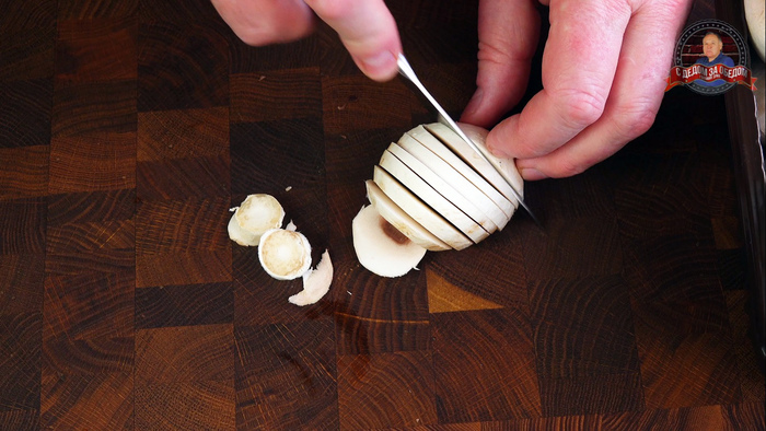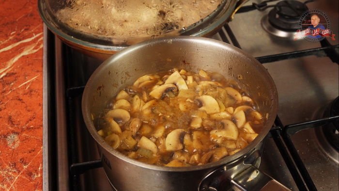 В сотейнике пассеруем репчатый лук на оливковом масле до прозрачного состояния. К нему добавляем шампиньоны, и обжаривая, выпарить из них влагу,