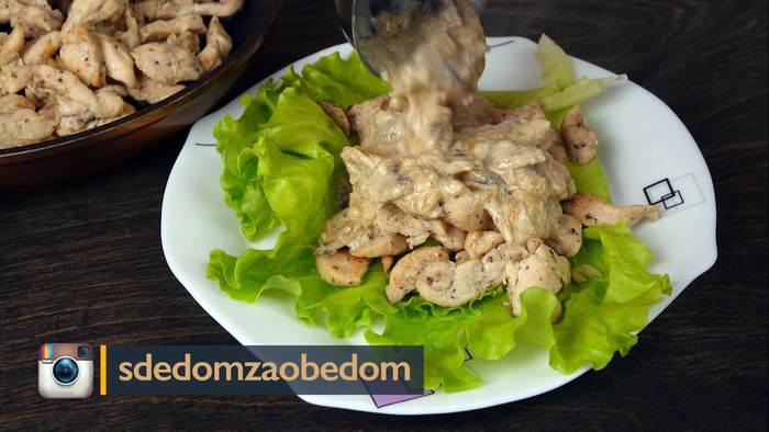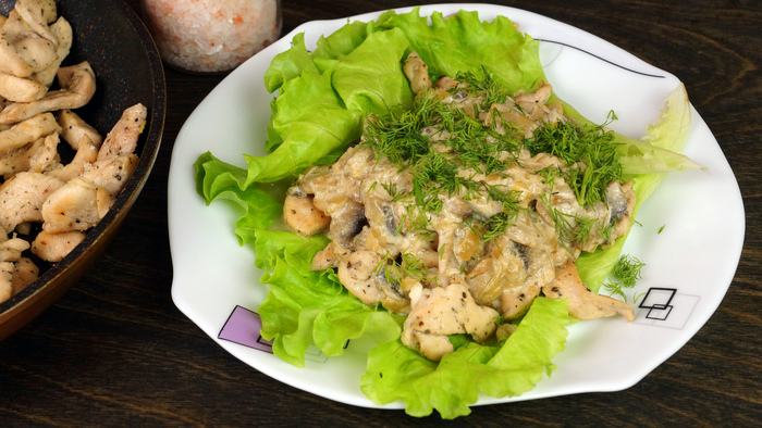 В порционную тарелку положить листья салата, на которые выкладываем обжаренные кусочки куриного филе, заливаем филе грибным соусом и украшаем измельченным укропом.