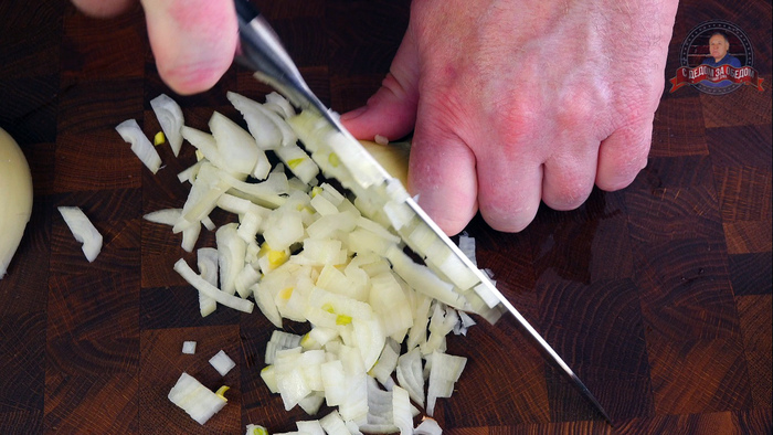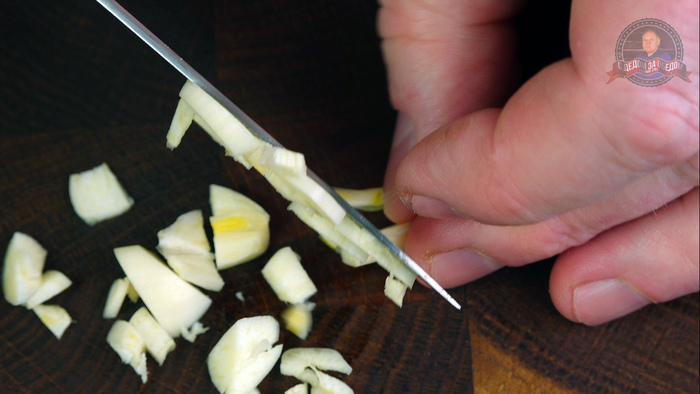 Нарезать шампиньоны и репчатый лук на мелкие кубики. Чеснок порезать мелко.