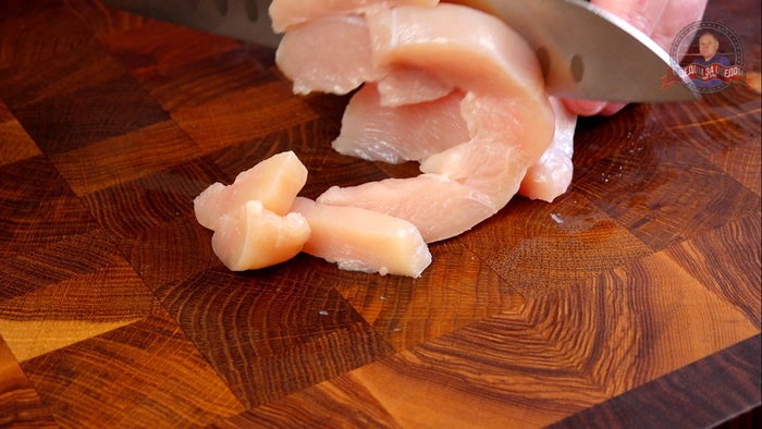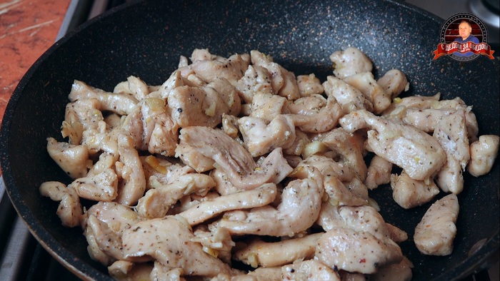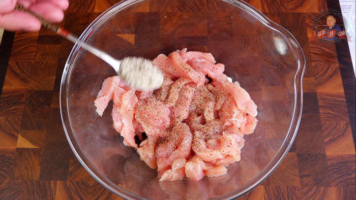 Куриное филе нарезать на полоски, добавить смесь перцев (белый, чёрный, розовый, зелёный) и соль по вкусу.