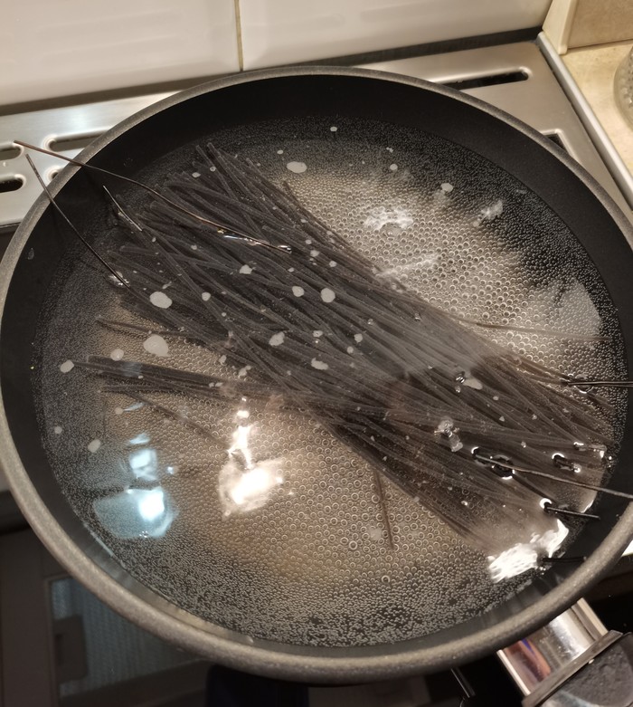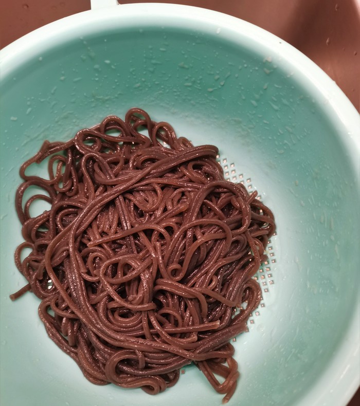 Слил через дуршлаг лапшу, а ей чёта поплохело. Цвет ушел, став серо-буро-малиновым. У спагетти с чернилами каракатицы нет такого бага.