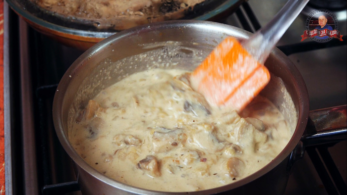 вливаем к ним сливки и доводим до кипения. Тушим 5 минут для соединения вкусов. Выключаем нагрев.