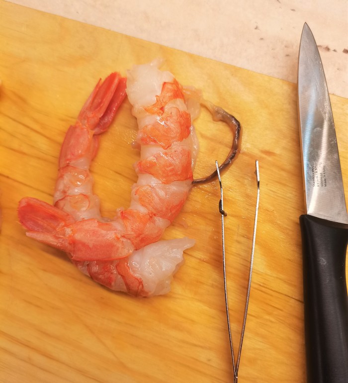 Лапшу довел до кипения и снял с огня. А из креветов повыпускал кишки.