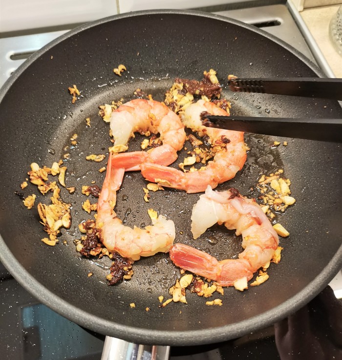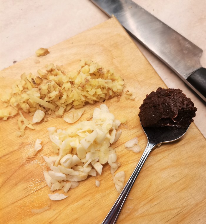 За вкус и запах будут отвечать мелко резанный чеснок и имбирь. В ложке соевой пасты достаточно соли, перца, экстрактов анчоусов и морских гадов. Всю эту мелочь разжариваю в масле подсолнечном с добавлением кунжутного. Масло вытягивает запахи и распространит вкус на креветок и лапшу.