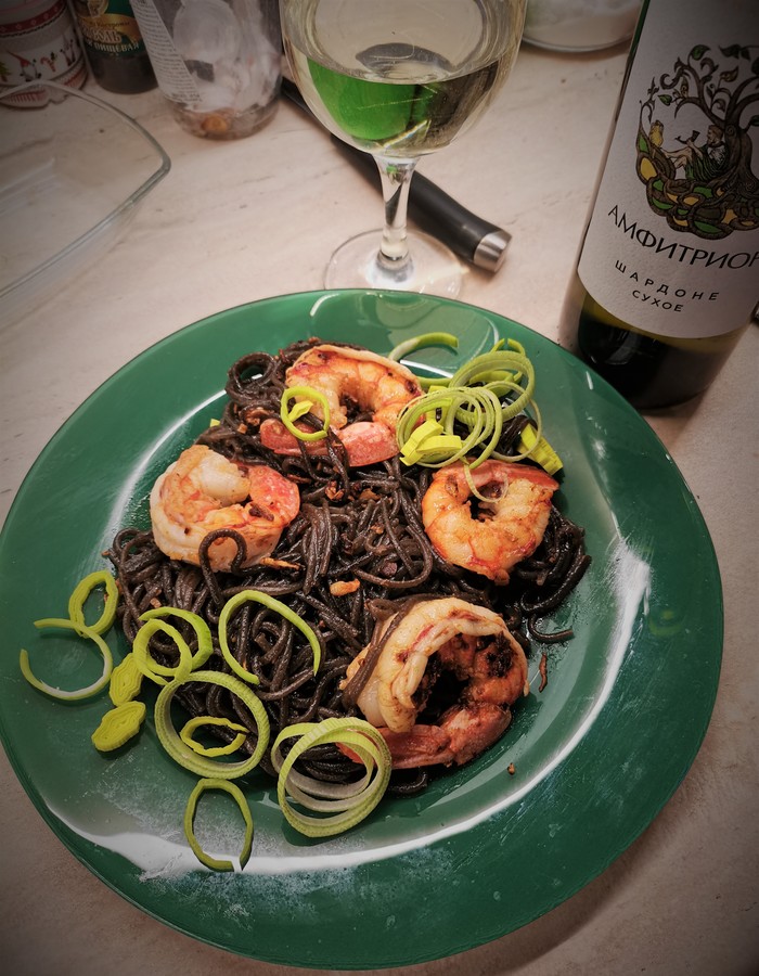 В одном чёрном-чёрном городе была чёрная-причёрная лапша (фунчоза с добавлением папоротника). А лежать на чёрной-причёрной сковороде ей одной одиноко, потому добавим для яркости цветов креветок и зеленухи. Ну и шардоне лишним не будет.