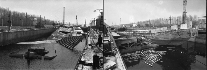 -баржа № 3802 находится в камере № 6 также в полузатопленном состоянии, корпус переломлен на расстоянии 1/3 длины судна от кормовой оконечности, восстановлению не подлежит.