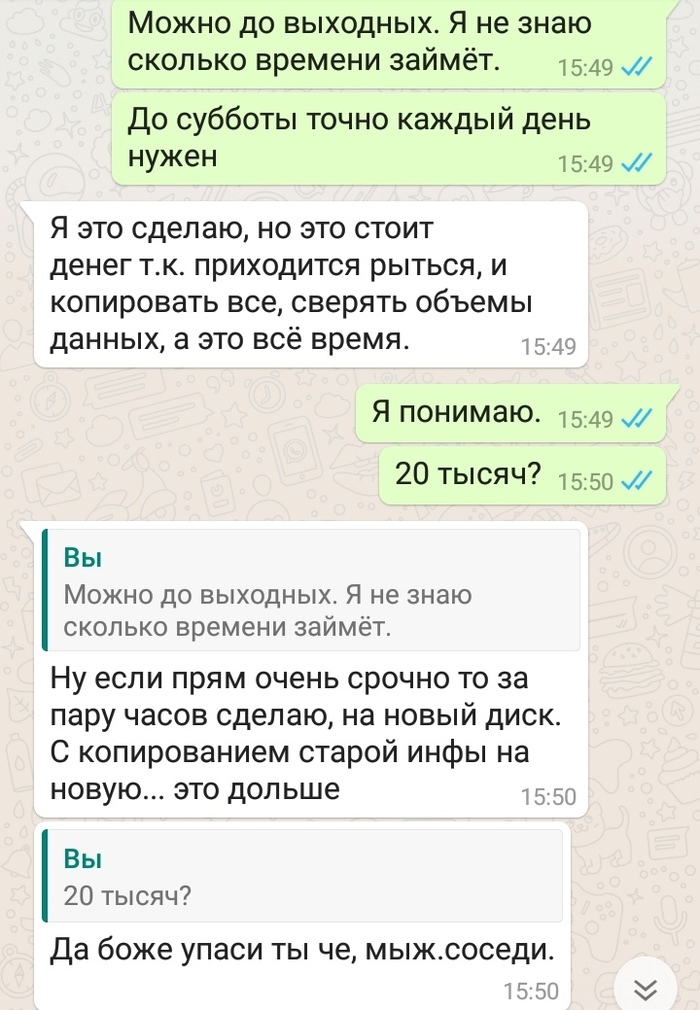 В районе 7. Думаю-на следующей неделе деньжат накидают и отдам за ремонт. Купил комплектующие (ноут очень медленно работает, часто зависает надолго). Накидал, купил почти за десятку две карты и диск, отложил 7 на ремонт. Всё готово, хотел отдать, но жена ненароком сказала-а не много 7 тысяч? Ну и решил погуглить, точнее в 2гисе ближайшие мастерские обзвонить.