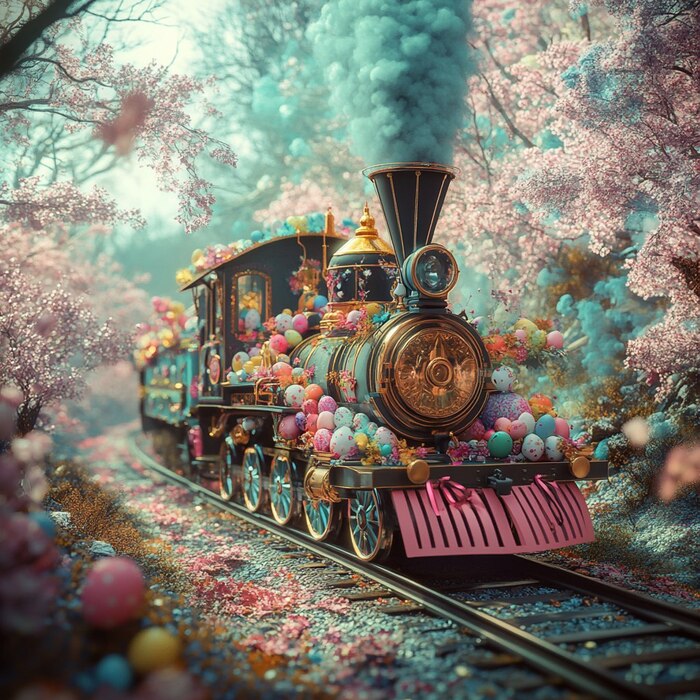 A vintage steam train covered in Easter decorations, colorful eggs and ribbons, moving through a blooming taiga forest, gentle light and magical atmosphere