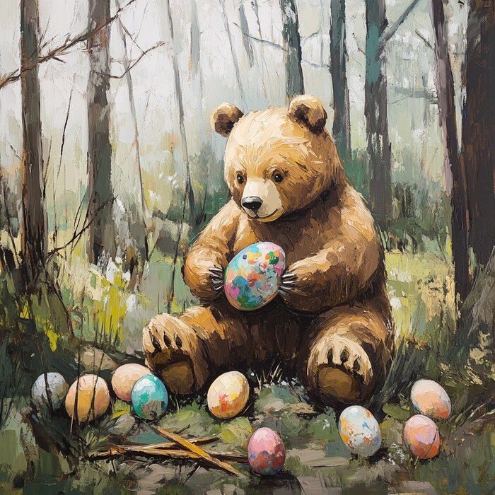 Brown bear painting Easter eggs in forest. Serious expression, careful brush strokes. Cozy atmosphere.