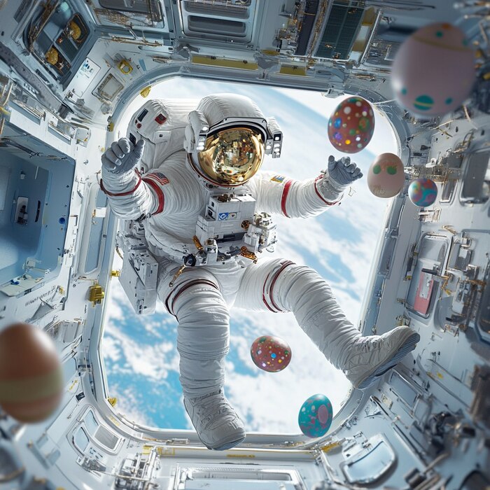 Cosmonaut on ISS catching floating Easter eggs. Zero gravity, space station interior. Funny and festive