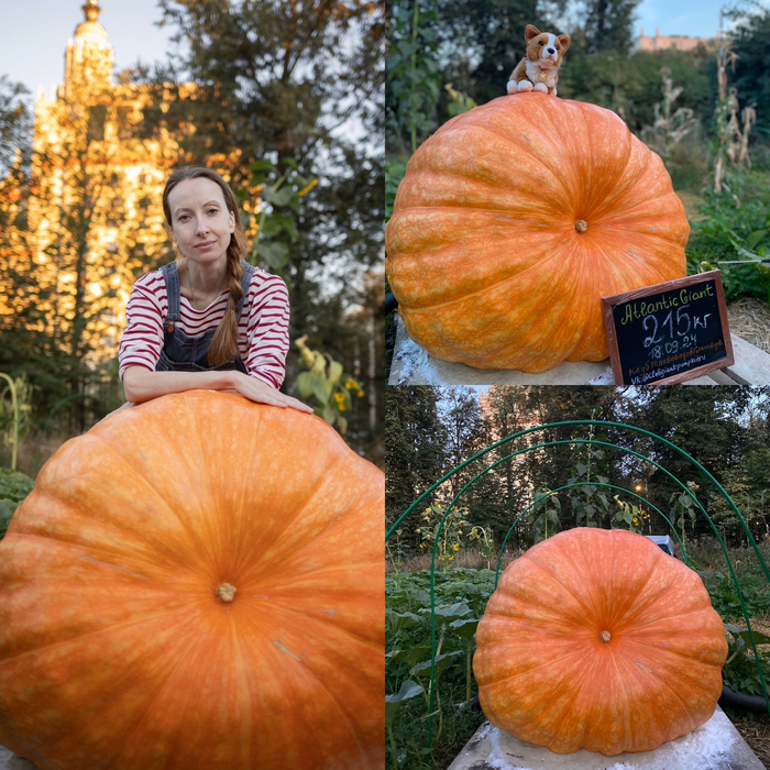 Наш следующий лот - гигантская тыква Atlantic Giant (Squash) зелёного цвета. Семена от сквоша выращенного в ботаническом саду МГУ в 2024 году. Вес был примерно 80 кг.
