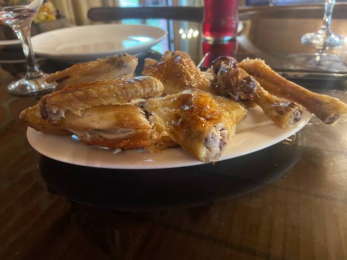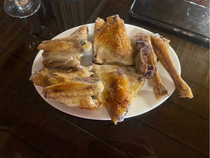 Цыпленок ничего. Малость пересушен, специй как таковых нет. Подается вот прям так. Ни веточки петрушки, ни половины помидорки. Просто курица, жареная в печи. Как бы и норм, но за тысячу рублей...
