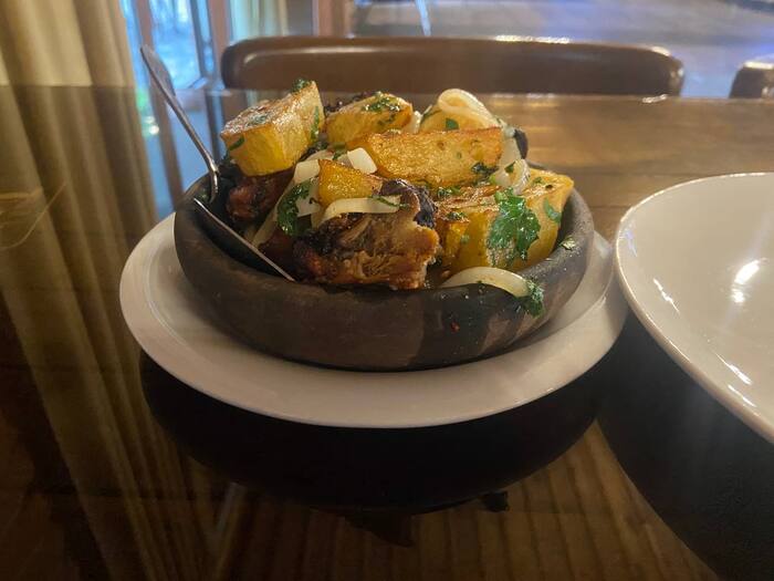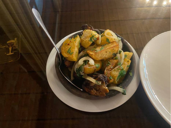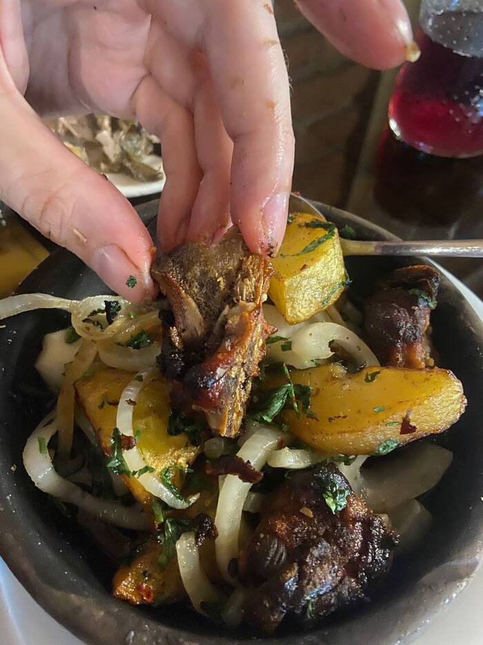 Саша любит оджахури, на него у него он очень надеялся. Разочаровался) Картошка ничего - не супер, но вкусная. А вот мясо полный провал. Первый раз мы видим в оджахури мясо с костями) Вернее даже кости с мясом. Там, где куски без костей они до ужаса пережарены. Разочарование, в общем.
