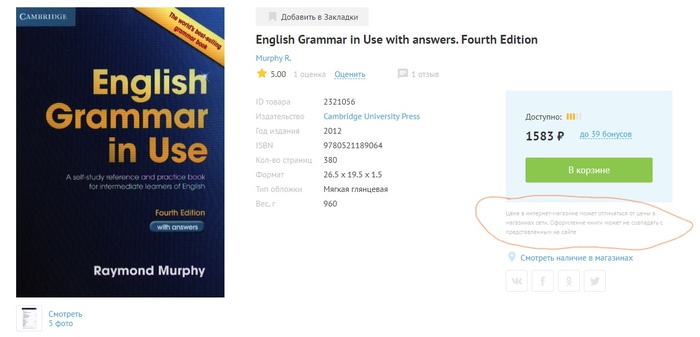 Собственно сама история. Решил я заиметь довольно популярную книгу, бестселлер, по изучению грамматики английского языка English Grammar in Use. То что брать ее надо исключительно в бумажном варианте сомнений не вызывает, так как это по сути рабочая тетрадь, в которой ты не только читаешь, но и пишешь. Все по темам, много практики и есть ключи к заданиям для самопроверки. В общем судя по отзывам идеально для самостоятельного изучения. Вот такую: