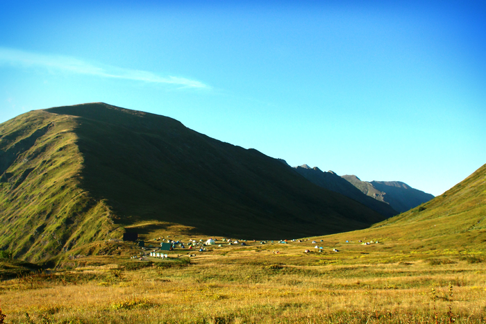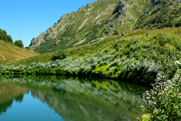 Очень жаль, но у нас было мало времени. Нужно было успеть на канатку до 17-30, поэтому пробежались до Малого озера, свернули к снежнику и вернулись в лагерь. Хотя там ещё куча всего непосмотренного. Жалкие людишки для понимания масштаба прилагаются