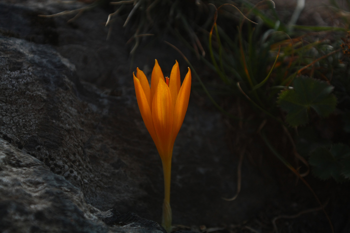 Жёлто-оражевый цветок - краснокнижный Шафран Шарояна или Крокус Шарояна. Очень маленький, но очень гордый цветок, торчит из камней в одиночестве и стойко переносит ультрафиолет, холодные ночи и жгучие дни.