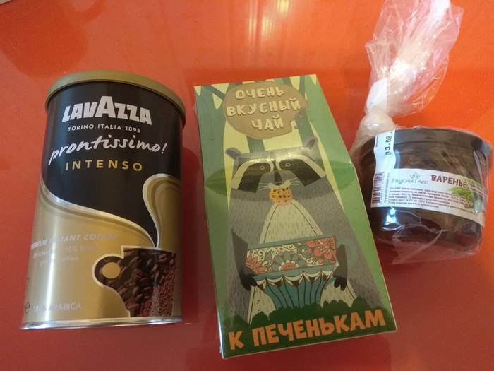 Кофе, чай и баночка варенья. Чай очень классно оформлен, а варенье не простое, а из сосновых шишек и с кедровыми орехами! Ну ооочень вкусное!