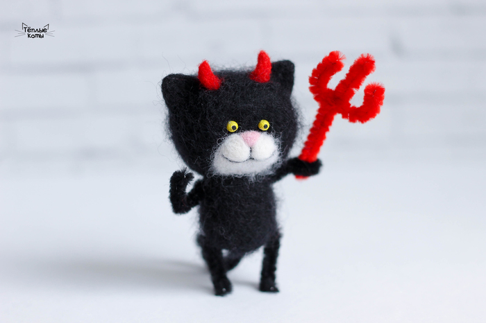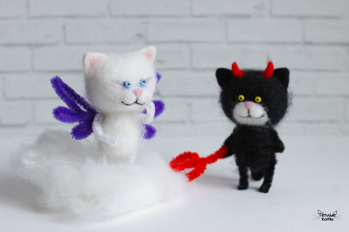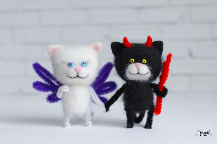 Всем привет! Люблю делать котиков, в этот раз у меня появились чертёнок и ангелок, оба своенравные и самодостаточные) Злые игрушки я делать не умею, поэтому даже чертёнок получился улыбчивый и добрый)