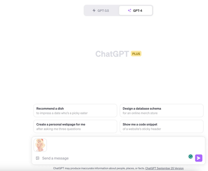 Загрузите изображение в ChatGPT и запросите его подробное описание. Для этого щелкните на GPT-4 и выберите "По умолчанию". Если вы являетесь подписчиком ChatGPT Plus, то в текстовом поле вы увидите значок "прикреплять изображения".