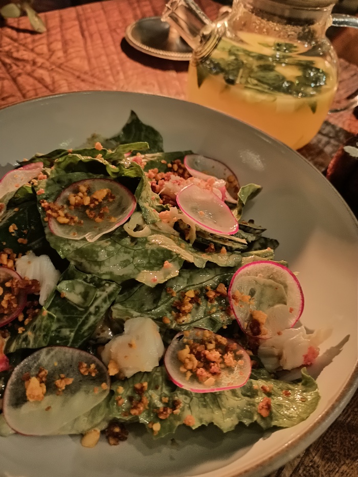 Как видно на фото выше ещё был заказан салат. Это был салат из шпината с камчатским крабом.