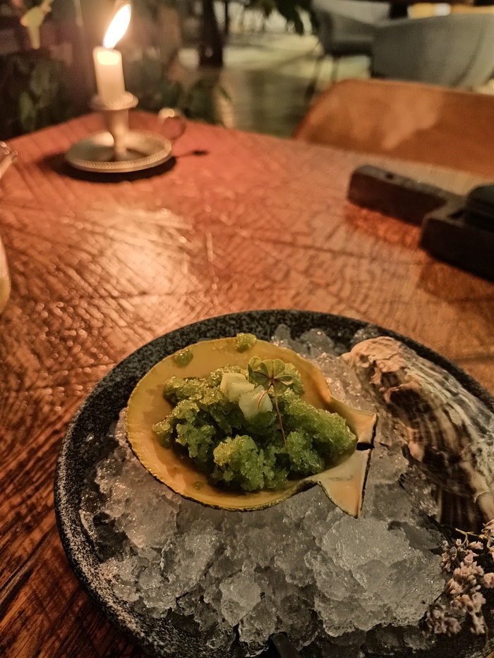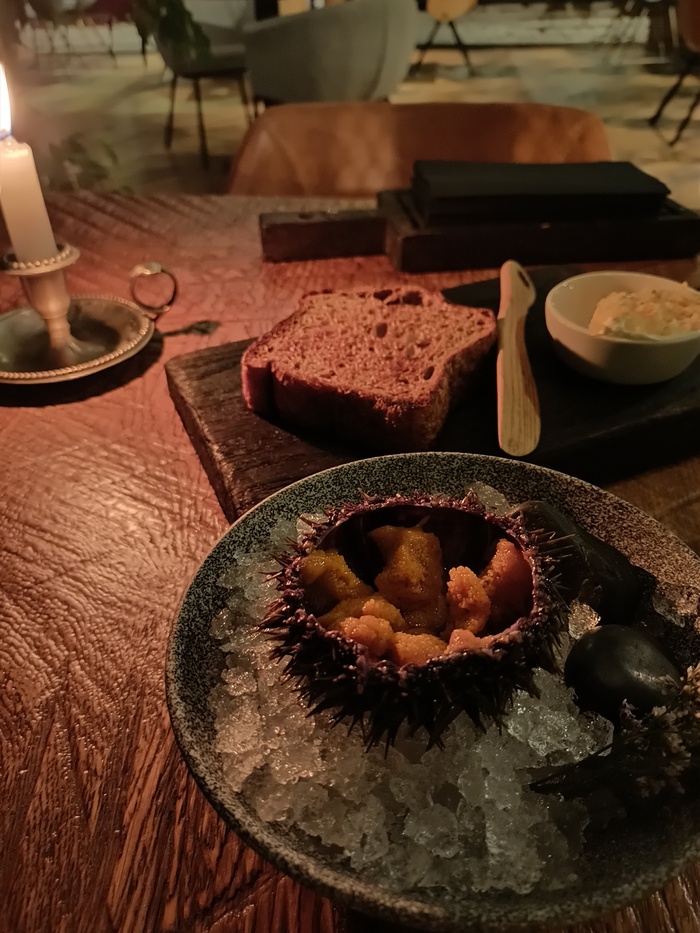 Морского ежа я ела до этого в другом месте и он был нежный, сладковатый на вкус, так что я немного офигела когда вместо ожидаемого вкуса поела морской воды. Как мне потом объяснили - в холода ежи опускаются глубже на дно и приобретают более морской йодистый вкус. Мне не понравилось.
