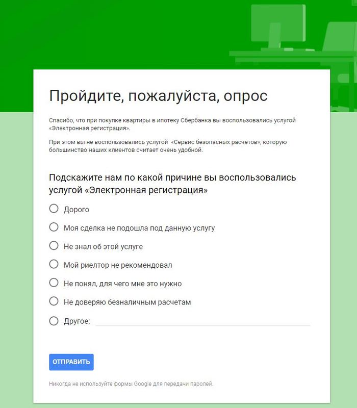 В конце прошлого года я купил квартиру, и воспользовался сервисом Сбербанка. Об этом запись тут. Квартира частично покупалась в ипотеку, и я воспользовался сервисом "электронная регистрация", все прошло хорошо. А сегодня получил письмо, с заголовком "Оцените качество сервиса Сбербанка" и следующим содержанием: