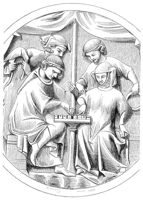 Велели принести шахматную доску, всю изукрашенную золотом и серебром, и фигуры — золотые в изумрудах.