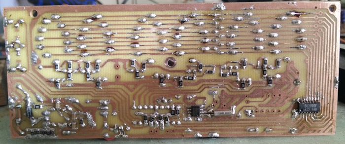 Плата была собрана наполовину на выводных элементах, поэтом получилась очень большой, кривой, но заработала, хоть и не сразу. Вот так она выглядит сверху: