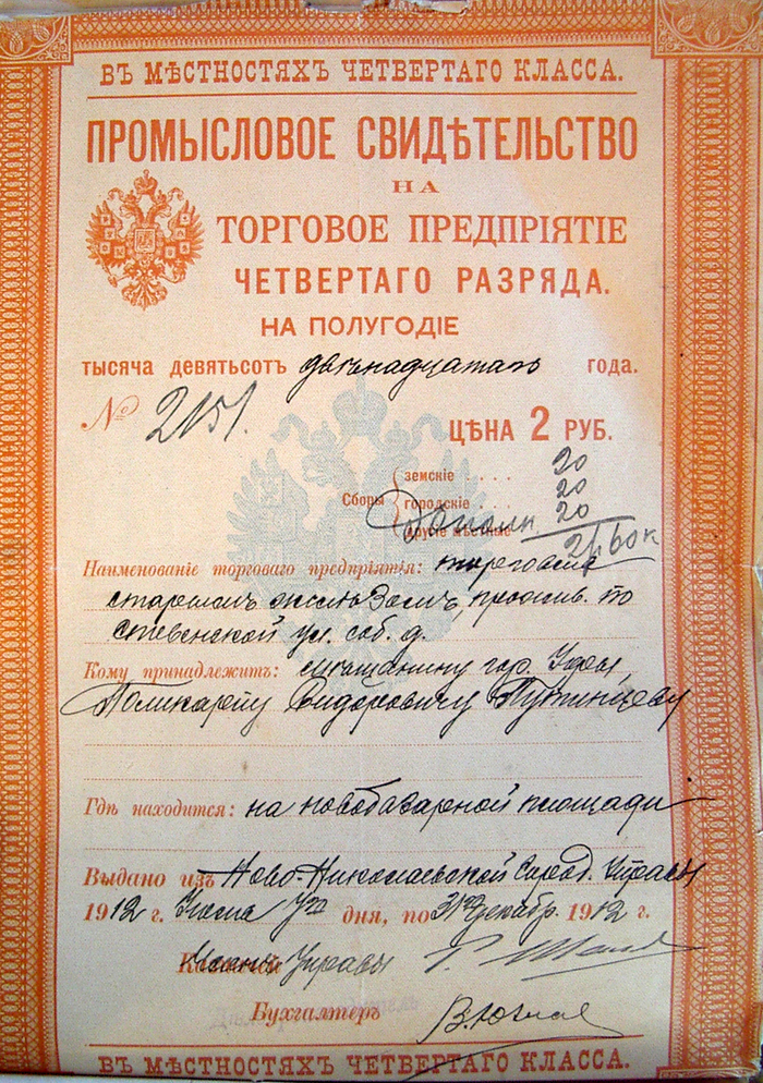 Промысловое свидетельство, выданное из новониколаевской городской управы торговцу старым железом. Будущий Новосибирск, уже тогда темпами роста заслуживший прозвище "Сибирского Чикаго", всё ещё оставался в последнем, четвёртом, классе местностей. Система разбивки городов и уездов на разряды по степени экономической развитости (это делалось Минфином "вручную") была одним из поводов для нареканий в адрес промыслового налога.