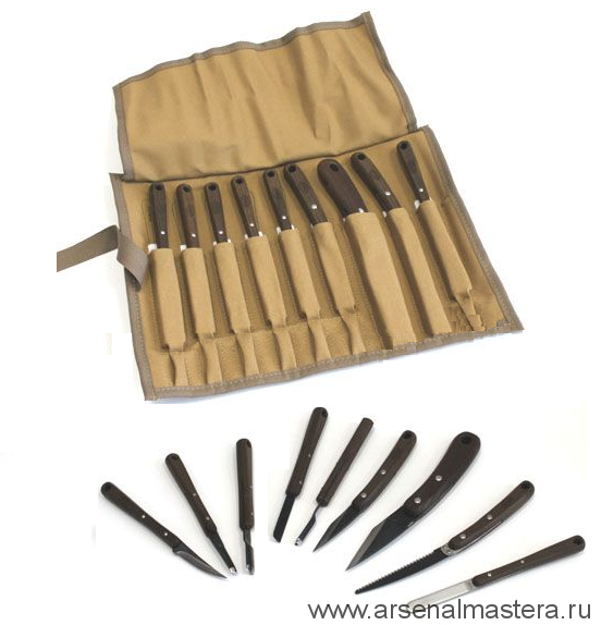 Инструменты выполнены из углеродистой стали с закалкой до 61HRC. Ручки из экзотической древесины - тика, слегка закруглены для удобства. В комплекте удобная сумка-скрутка с защитой от повреждений режущим инструментом. В каждом отделении для инструмента вставлена пластиковая гильза, и место каждого инструмента подписано. Компания HIRO производит прекрасные инструменты для резчиков начав как и большинство японских компаний с ножей. Данный набор инструментов не является экспортным вариантом - он широко продается в Японии, и является самым популярным среди местных резчиков.