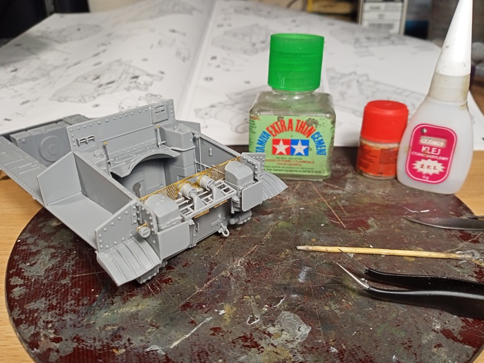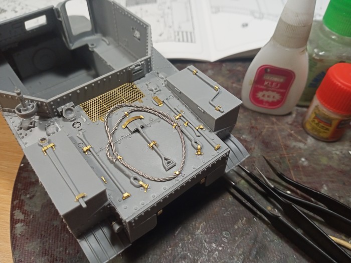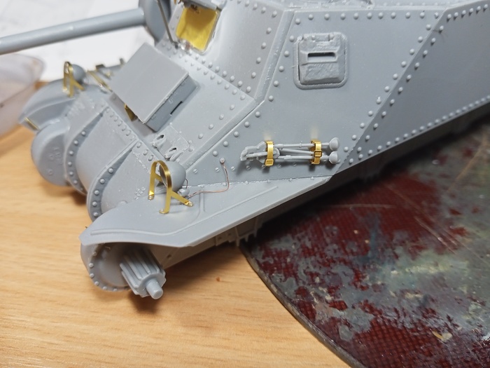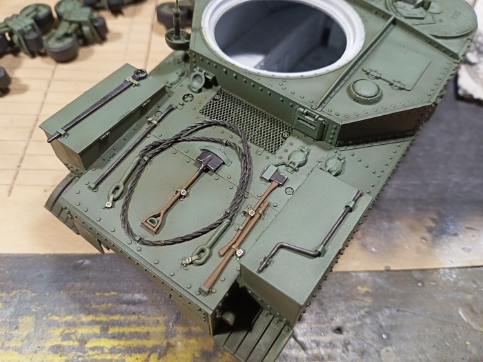 Кистями окрашена мелочёвка. Пришлось красить всё уже на танке, так сказать, по-японски. Мне этот метод не очень удобен, но крепления из травления не оставили альтернатив.