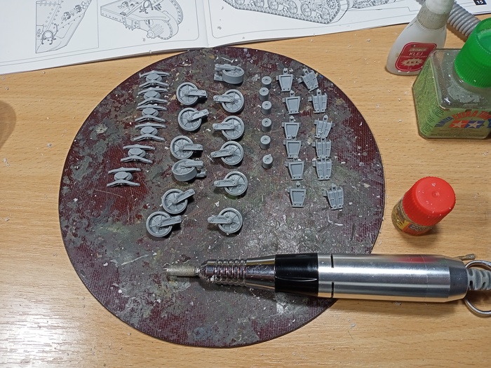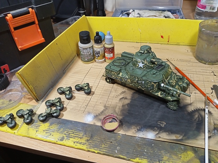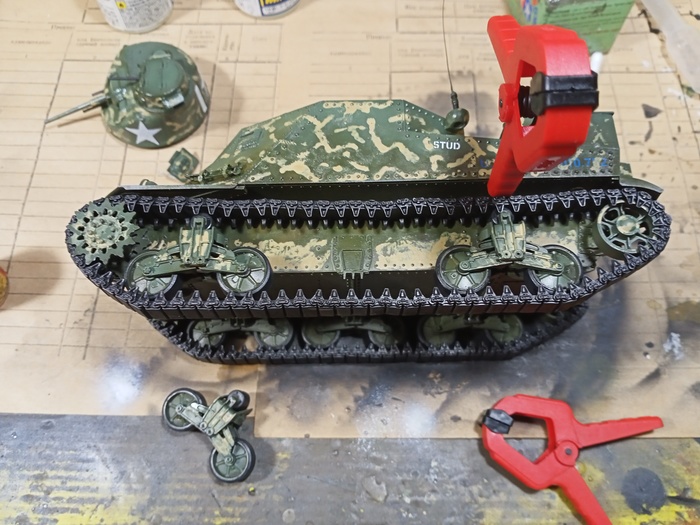 Камуфляж снова задут глянцевым лаком, дабы потом не стёрся вместе со смывкой. Собрана ходовая.