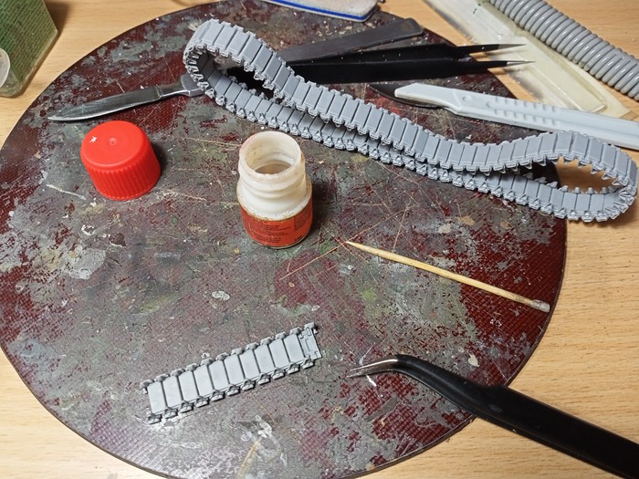 А так гусеницы собираются. Оптимально использовать густой клей, чтобы он не затёк в пазы, иначе соединения склеятся и не будут "работать".