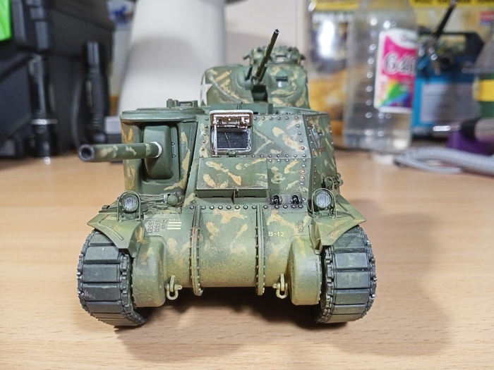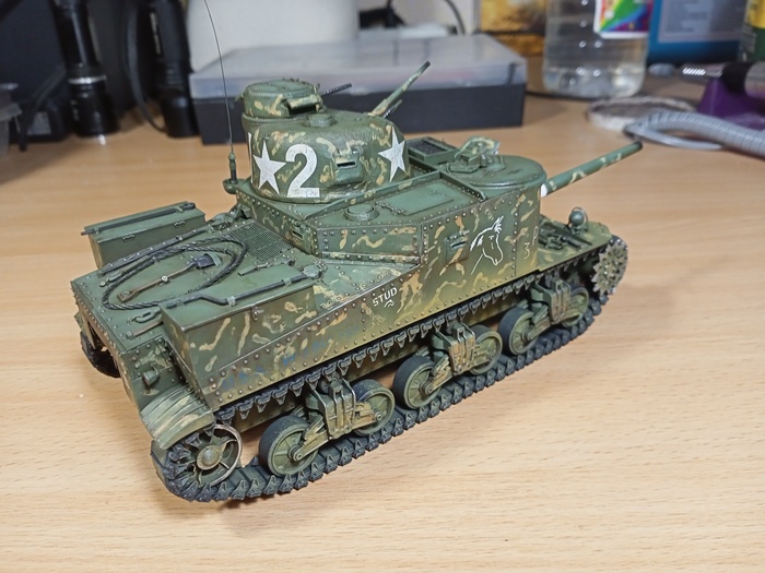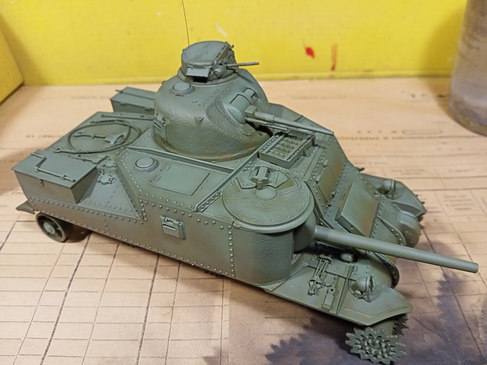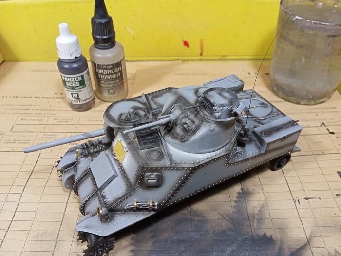 Танк задут матовым лаком с матовой присадкой. Чёрным надут нагар на орудия и около выхлопных труб, песочно-жёлтым надуты запыления на ходовую и борта. Пигменты не применял. По граням и заклёпкам прошёлся сухой кистью с металликом и простым карандашом 6Б. Удалена маска с ветрового стекла, приклеен дворник и люк. Приклеены стёкла фар. Габаритные огни и стволики пулемётов аккуратно вскрыты глянцевым акриловым лаком кисточкой.