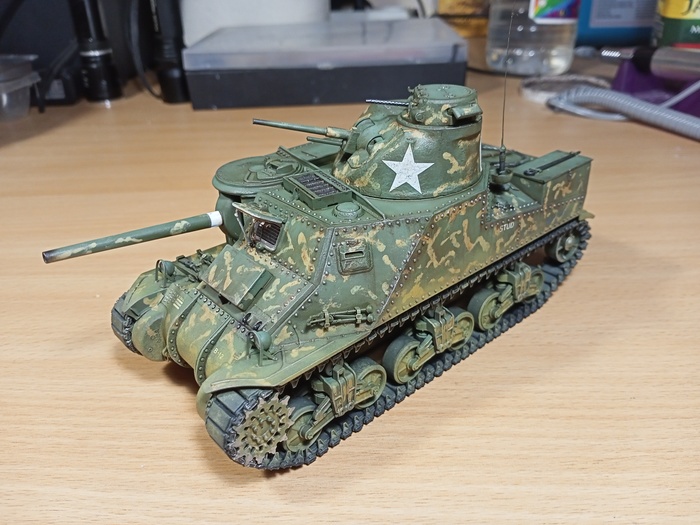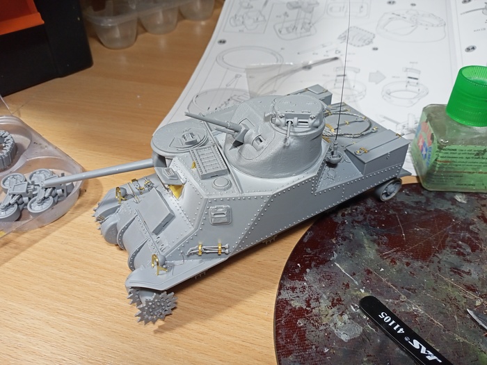 О наборе: Новый (2019 год) и очень вкусный набор от украинского MiniArt. Набор сделан на основании М3 с полным интерьером путём удаления деталей интерьера. Набор сложный, сделанный явно для моделистов высокого уровня, притом имеет весьма демократичную цену. В коробке лежит 57 литников и литничков (я не шучу, их 57! Другое дело, что на некоторых всего пара деталей...), литник с прозрачными деталями, рамка с фототравлением в плотном конверте (молодцы!), декаль и инструкция. Не нашёл указания на количество деталей, а сам считать не стал, но их в наборе что-то около полутора тысяч. Качество литья на высоте, нет облоя, утяжин и прочих дефектов. Детализация превосходна: фактура литья, болты, заклёпки и прочие мелочи выполнены очень аккуратно, оба орудия имеют отверстия и нарезы(!), показаны штампы производителей и ещё много чего. Поскольку изначально модель подразумевала интерьер, детали корпуса и башни имеют детализацию с обоих сторон, притом изнутри нет следов толкателей, как это было на Тигре с интерьером от Академии. Стыкуемость на высоте, у меня возникли только некоторые проблемы со сборкой тележек ходовой. Отдельного упоминания заслуживает травление: тут вам не только решётки МТО, из травла выполнены крепежи шанцевого инструмента, ободки направляющих колёс, защита фар и много ещё чего - подобное я видел только на моделях от Rye Field Models. Минус: нет альтернативных деталей из пластика (как у того же RFM), потому для новичков данный набор будет практически несобираем. Несобираемым для моделиста с невысокой усидчивостью сделает его и полностью рабочая гусеница, где каждый трак собирается из 4 деталей (всего 632 детали только на гусеницы!), а ведь их все нужно отделить, обработать, собрать особым образом... Однако если потратить время и нервы, гусеница получится действительно рабочей (а не как в Т-70 того же производителя). Инструкция очень хороша, всё понятно и подробно, дана схема окраски на 8 вариантов: 2 американских, 5 советских и один трофейный немецкий. Декаль тонкая и красочная, нареканий к ней нет. Все люки и лючки можно сделать открытыми, но в этом нет особого смысла при отсутствии интерьера. В голову приходят только 2 недостатка модели: отсутствие металлического тросика (в инструкции указано изготовить его самому) и белая полоса на пушке, которая не дана почему-то декалью. В целом, превосходный набор для опытного моделиста по цене намного меньшей, чем у китайских аналогов!