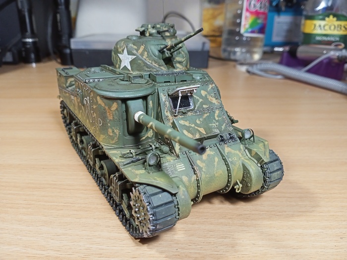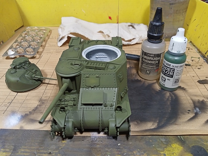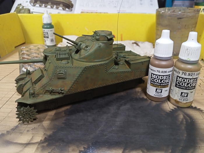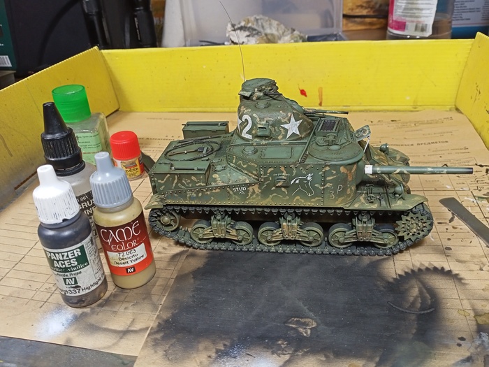 Вот, кстати, и камуфляж. В интернете нашёл фото М3, который поверх базового оливкового цвета нёс небрежно намалеванный в поле камуфляж песочного цвета. Для создания такого эффекта была смешана современная пустынная танковая краска с песочно-жёлтой и добавлена жидкость Vallejo Chipping Medium. Смесь наносилась кистью, а после высыхания чуть влажной жёсткой кистью частично удалена. Получился эффект плохо взявшейся и частично слезшей краски.