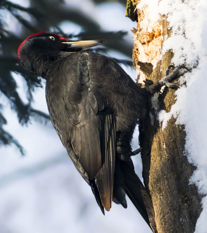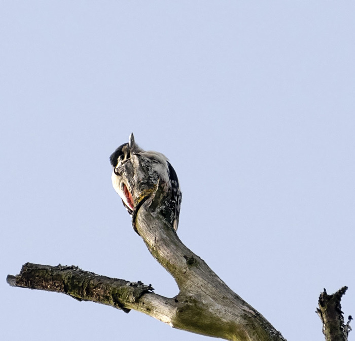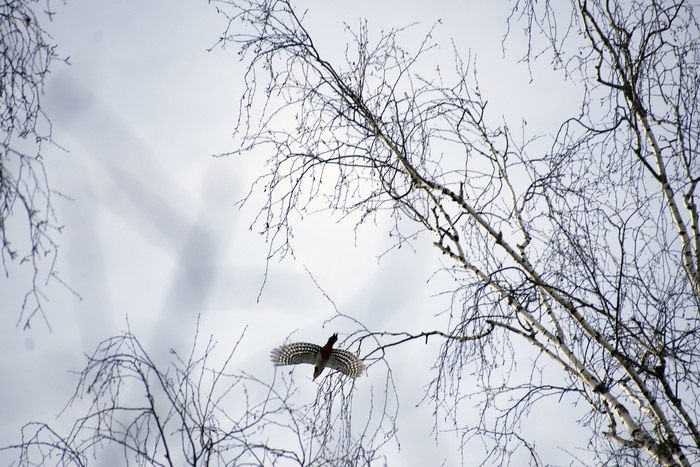Далее, выйдя из хвойной части леса, я вышел на берёзовое редколесье. Прям идеальное место для всяческих дятлов из-за наличия достаточного количества сухих деревьев. И точно, побродив там, удалось встретить большого пёстрого дятла и желну. И, если БПД это штатный дятел в лесу, то желна довольно редко встречается. А сегодня произошла уже вторая встреча за февраль, что есть большая удача.