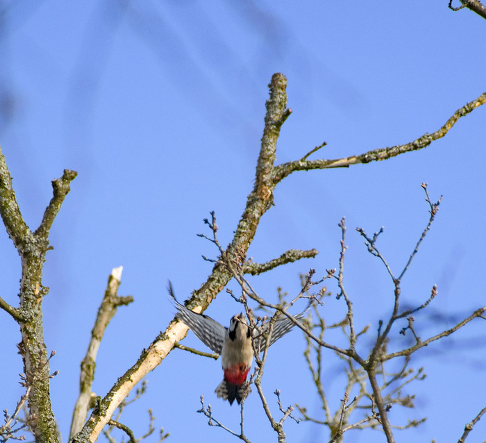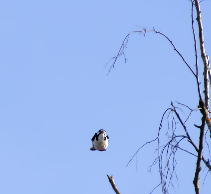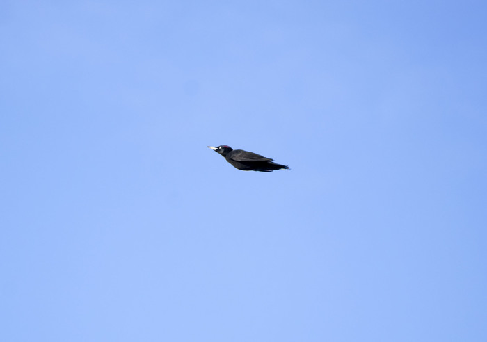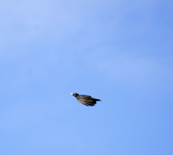 Этот дядька тоже сначала носился меж деревьев и пытался понять откуда раздаётся голос его соперника. Но пришлось ему садиться на дерево для точной локализации меня. Покрутив головой и определив моё положение дятел продолжил свои вокальные приёмы. Всласть накричавшись на меня, желна полетел по своим делам. Но в это раз я был к этому и успел сделать несколько фотографий летящей птицы.